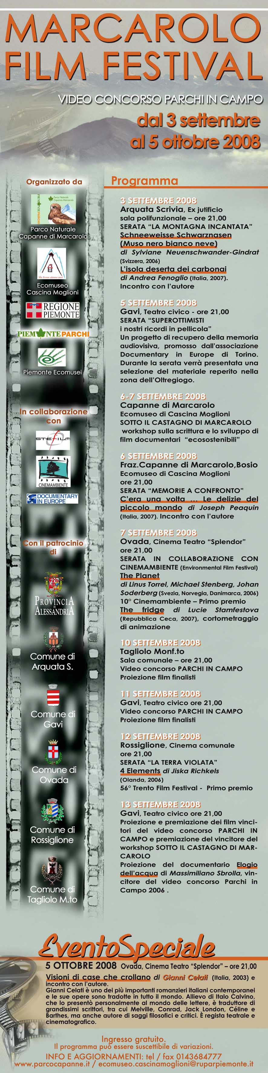 Il Marcarolo Film Festival 2008 si è concluso con un evento speciale in programma il 5 ottobre 2008 alle ore 21,00: lo scrittore Gianni Celati ha presentato il suo film documentario Visioni di case che crollano.