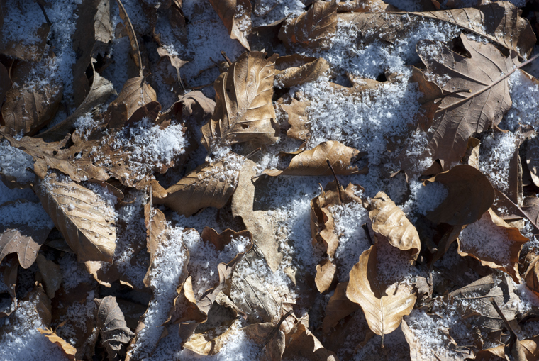 Appena più in là una spolverata di brina copre le foglie di faggio e di rovere, come fosse neve.