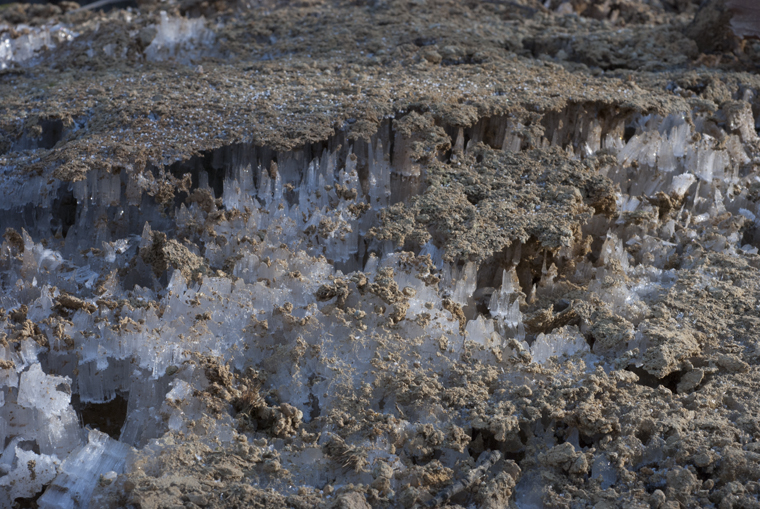 L’immagine potrebbe essere primaverile ma è dell’8 dicembre 2012. Siamo sul Monte Colma, a circa 600 metri, la temperatura è sotto lo zero: non lo testimonia il termometro – che non abbiamo – ma le formazioni ghiacciate che sono sotto lo strato superficiale del terreno.