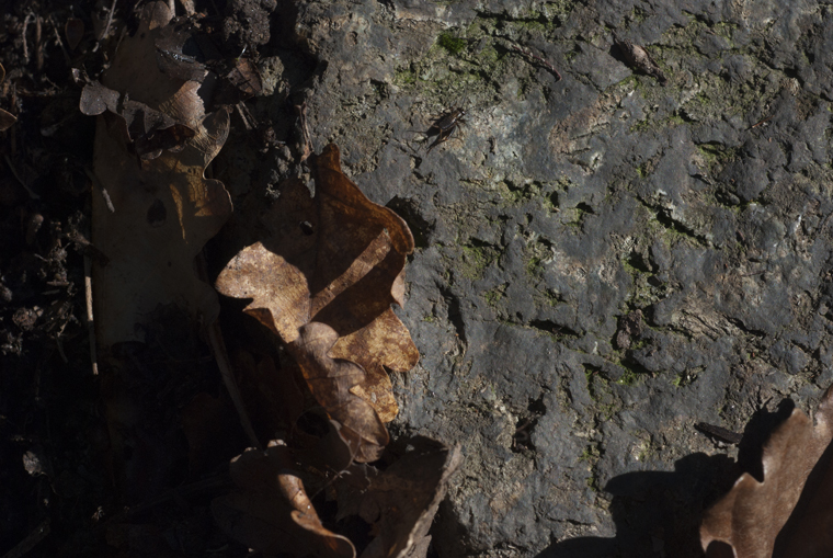 Nonostante il gelo basta guardare sotto le foglie secche, nei luoghi riparati dai ginepri e dalle eriche, per trovare altri insetti attivi: nell’immagine sopra, al centro in alto della foto, si vede un giovane di Grillo dei boschi (Nemobius sylvestris Bosc 1792).