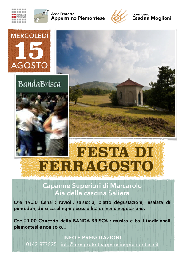 Le Aree Protette dell’Appennino Piemontese e l’Ecomuseo di Cascina Moglioni propongono per mercoledì 15 agosto, la tradizionale FESTA DI FERRAGOSTO, bella festa popolare sull’aia della Cascina Saliera a Capanne Superiori, storicamente organizzata dagli abitanti di Capanne di Marcarolo per la ricorrenza della festività della Madonna dell’Assunta e recuperata dall’Ecomuseo e dal Parco Capanne di Marcarolo a partire dal 2002.