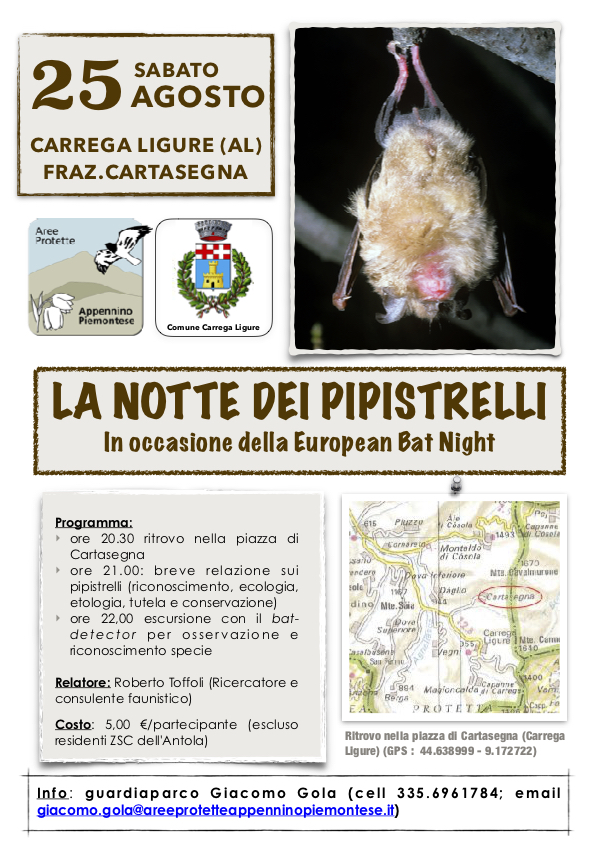 Nell’ambito del calendario APPENNINO RACCONTA delle Aree Protette dell’Appennino Piemontese è stata inserita, dopo i recenti accertamenti di presenza di diverse specie di pipistrelli sul territorio , una serata sui pipistrelli nell’ambito della campagna europea “European Bat Night” .
