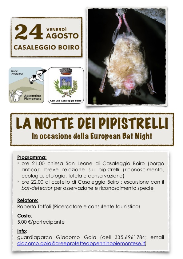 Nell’ambito del calendario APPENNINO RACCONTA il Parco Naturale delle Capanne di Marcarolo propone per venerdì 24 agosto nel borgo antico di Casaleggio Boiro una serata dedicata ai pipistrelli, in occasione della European Bat Night, con una relazione e una escursione a cura del dott Roberto Toffoli – ricercatore e consulente faunistico finalizzata alla conoscenza e al riconoscimento in natura di questi piccoli animali.