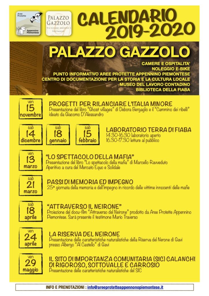 Appennino News Calendario Palazzo Gazzolo 2019 – 2020 4 Novembre 2019 Allegati Calendario Palazzo Gazzolo (331 kB) Precedente Avviso Pubblico per la selezione di n. 1 collaboratore/collaboratrice altamente qualificato a supporto delle attività di comunicazione riferite alla gestione del progetto europeo "LIFE WOLFALPS EU" nell'ambito del programma "LIFE18 NAT/IT/000972" Più recente Laboratorio "Terra di Fiaba" Potrebbe anche piacerti Progetto didattico “Pensare come una montagna” 28 Novembre 2024 Monitoraggio Lupo: Pubblicati i risultati dall’Università di Torino della stima della popolazione 2023/2024 nelle Regioni Alpine 22 Gennaio 2026 Mostra fotografica all’Ecomuseo di Cascina Moglioni dedicata al mondo rurale di Capanne di Marcarolo 2 Aprile 2019