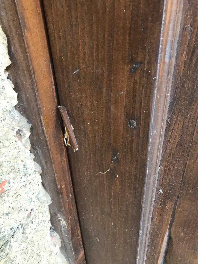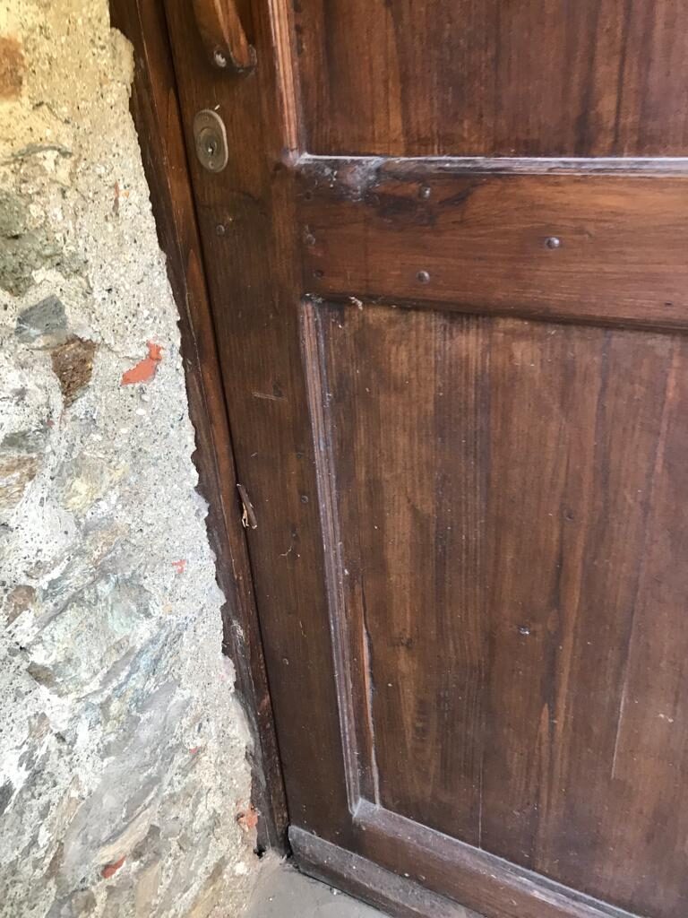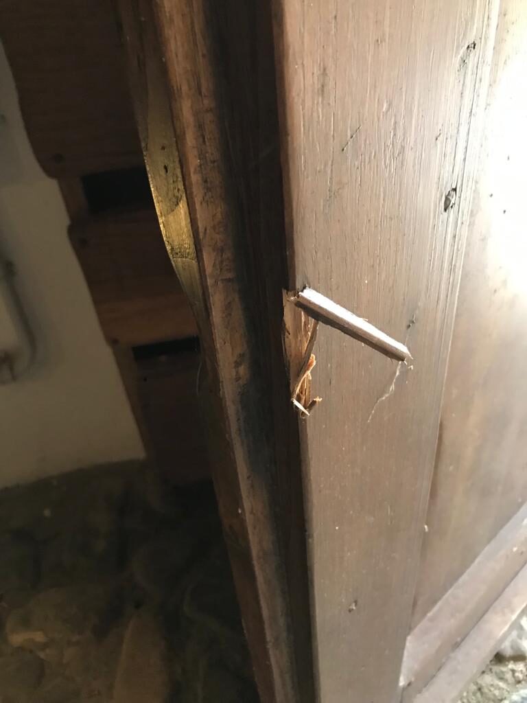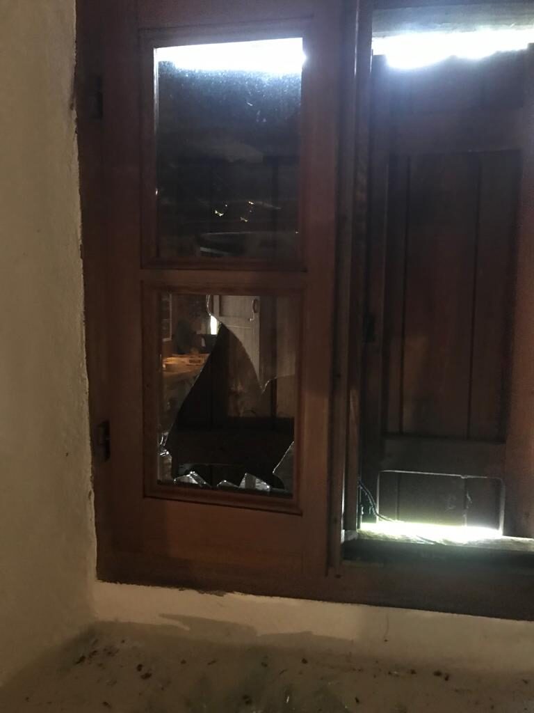 Probabilmente con un piede di porco hanno provato ad aprire la porta, rovinandone uno spigolo, dopodiché hanno aperto la persiana e spaccato il vetro della piccola finestra.