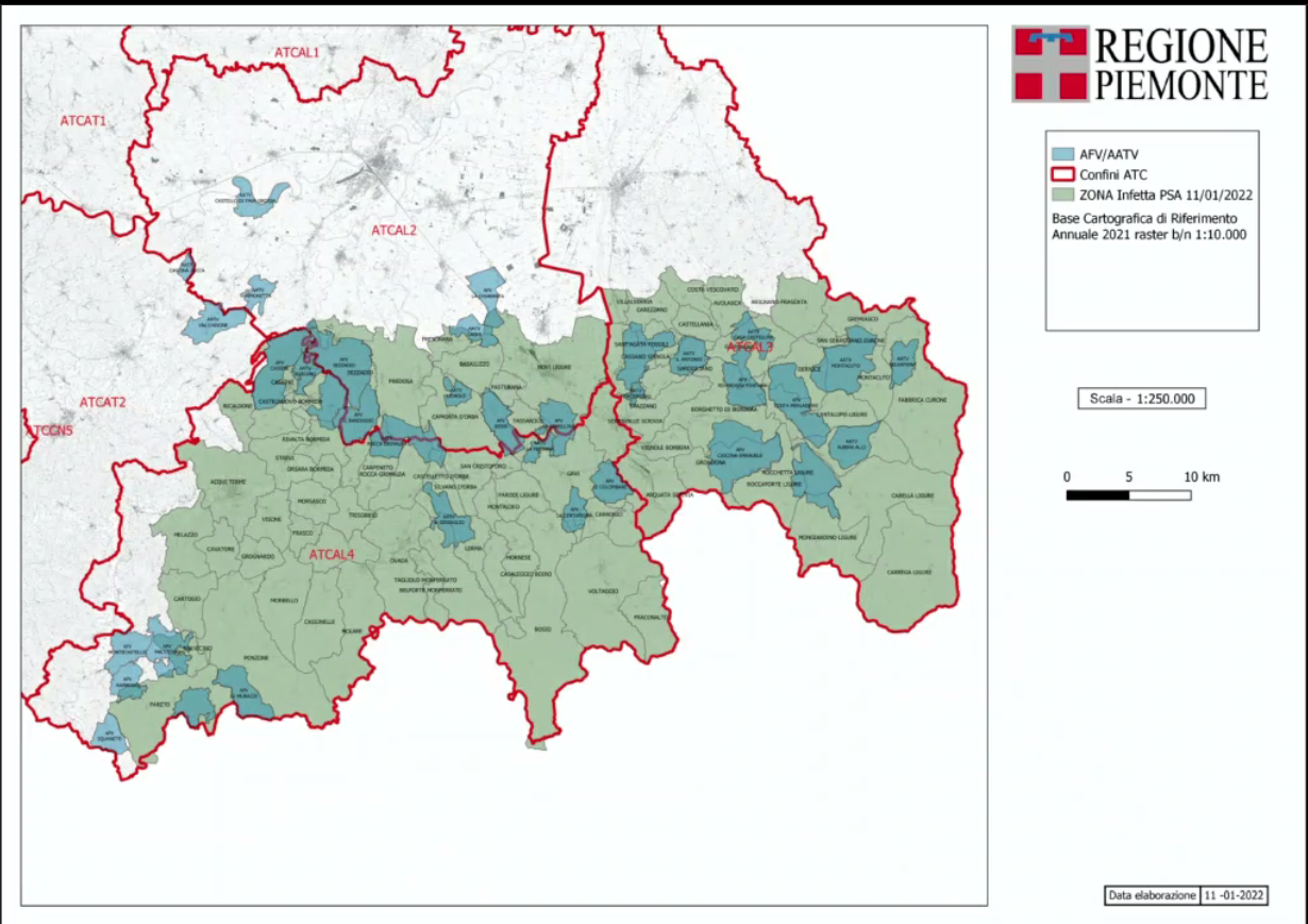 Inoltre in Regione Piemonte a seguito del Decreto del Presidente della Giunta Regionale 22 gennaio 2022, n. 7 è stato ordinato il divieto di svolgimento di qualsiasi attività venatoria di tutte le specie, comprese le attività di addestramento, allenamento e prove con i cani nonché di gestione faunistica sul territorio compreso nell’area di 10 km confinante con la Zona Infetta.