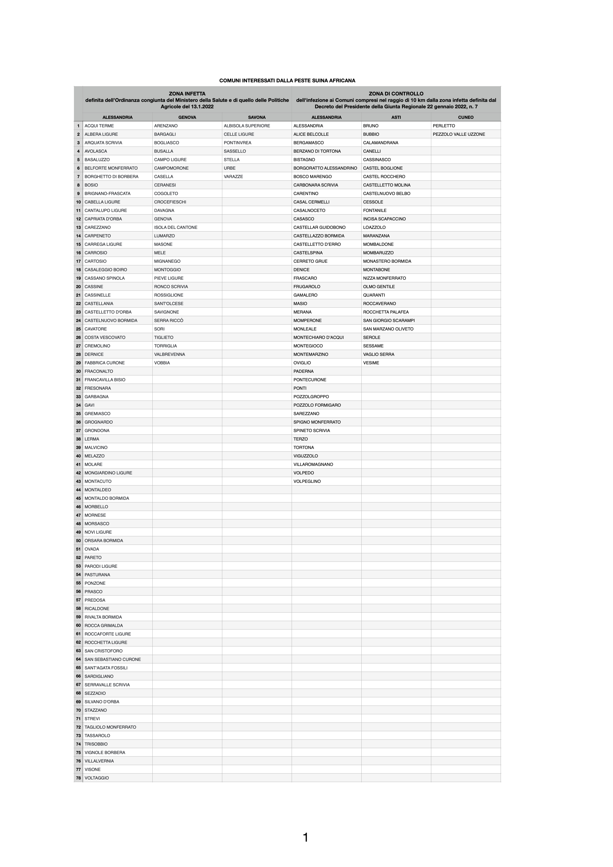 Di seguito i Comuni interessati dall’emergenza della Peste Suina Africana: