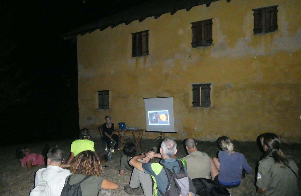 L’escursione notturna è stata condotta dalle guardiaparco Daniela Roveda e Mara Calvini, prevedendo alcune soste per illustrare le emergenze storiche e naturalistiche presenti lungo il cammino e per ascoltare i canti degli animali notturni. Mara Calvini, naturalista-chirotterologa ha utilizzato il bat detector per rilevare gli ultrasuoni emessi dai pipistrelli e ne ha spiegato il funzionamento ai partecipanti. Sono state identificate le seguenti specie: pipistrello di Savi (Hypsugo savii), pipistrello albolimbato (Pipistrellus kuhlii), pipistrello nano (Pipistrellus pipistrellus). Arrivati all’Ecomuseo di Cascina Moglioni, Elisa Arecco – operatrice ecomuseale – ha proposto una presentazione all’aperto intitolata Notti stellate, con un excursus sulla rappresentazione del cielo stellato dall’ultima immagine NASA dell’ammasso di galassie SMACS 0723 fino all’antichissimo Disco di Nebra (1600-600 a.e.v.). All’escursione notturna hanno partecipato 20 persone.