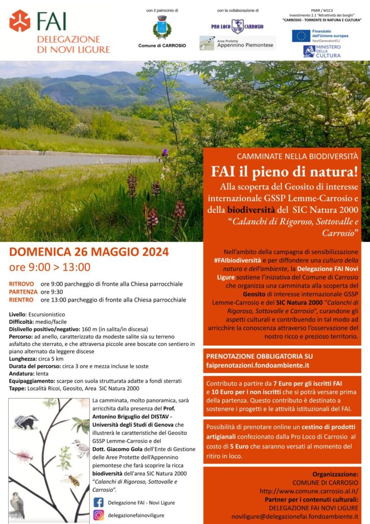 Domenica 25 maggio la Delegazione FAI (Fondo per l’Ambiente italiano) di Novi Ligure, nell’ambito della campagna di sensibilizzazione #FAIbiodiversità e per diffondere una cultura della natura e dell’ambiente, organizza una camminata alla scoperta del geosito di interesse internazionale GSSP Lemme Carrosio del SIC (Sito di Importanza Comunitaria) dei calanchi di Rigoroso, Sottovale e Carrosio.