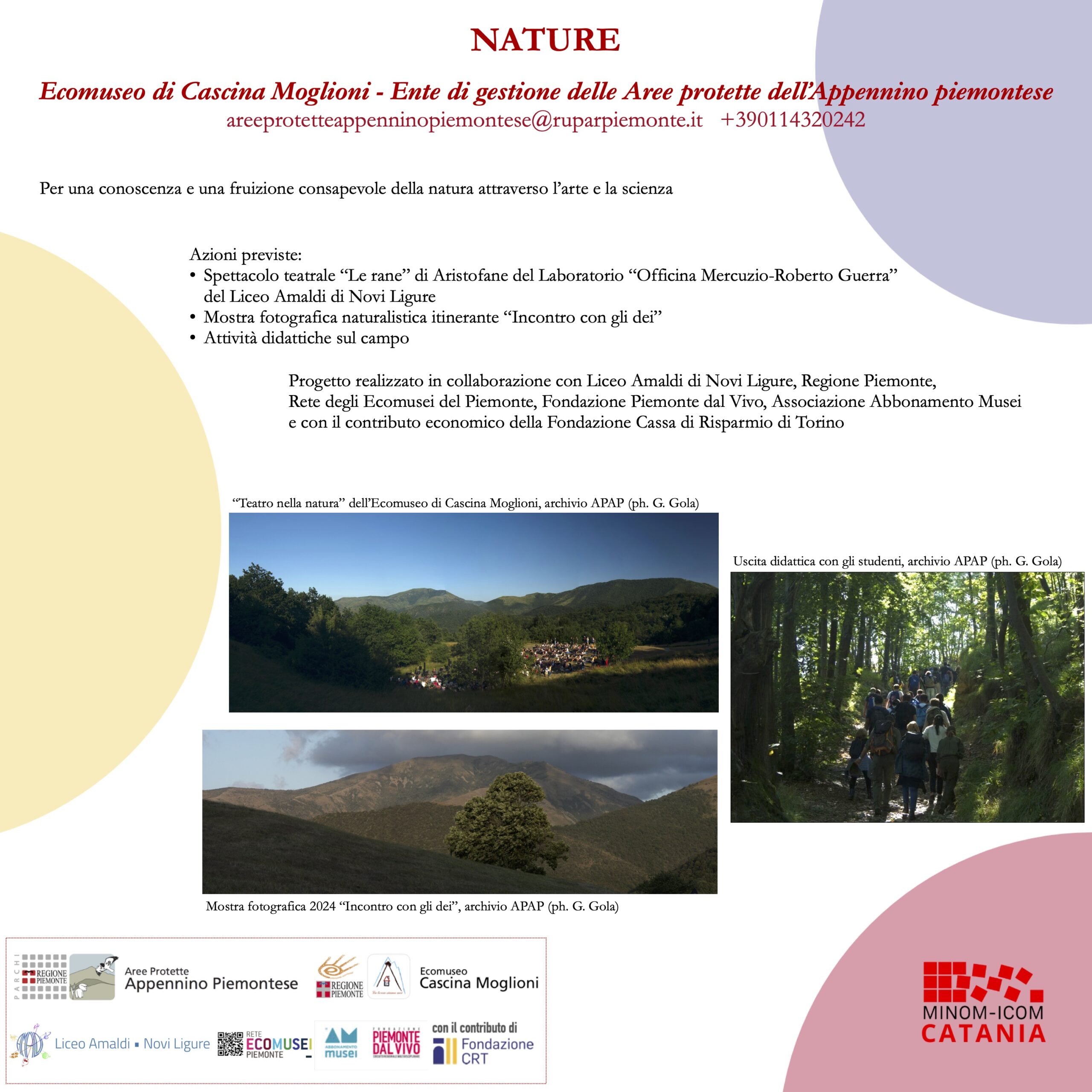 NaturE, progetto realizzato in sinergia con autorevoli istituzioni territoriali (Regione Piemonte, Rete degli Ecomusei del Piemonte, Associazione Abbonamento Musei, Fondazione Piemonte dal Vivo) e con il contributo economico della Fondazione CRT, vuole aprire la realtà ecomuseale di cascina Moglioni agli studenti liceali della zona, proponendo percorsi di interpretazione del patrimonio culturale e naturale attraverso la scienza e l’arte.