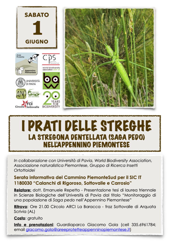 Relatore: dott. Emanuele Repetto – Presentazione tesi di laurea triennale in Scienze Biologiche dell’Università di Pavia dal titolo “Monitoraggio di una popolazione di Saga pedo nell’Appennino Piemontese”