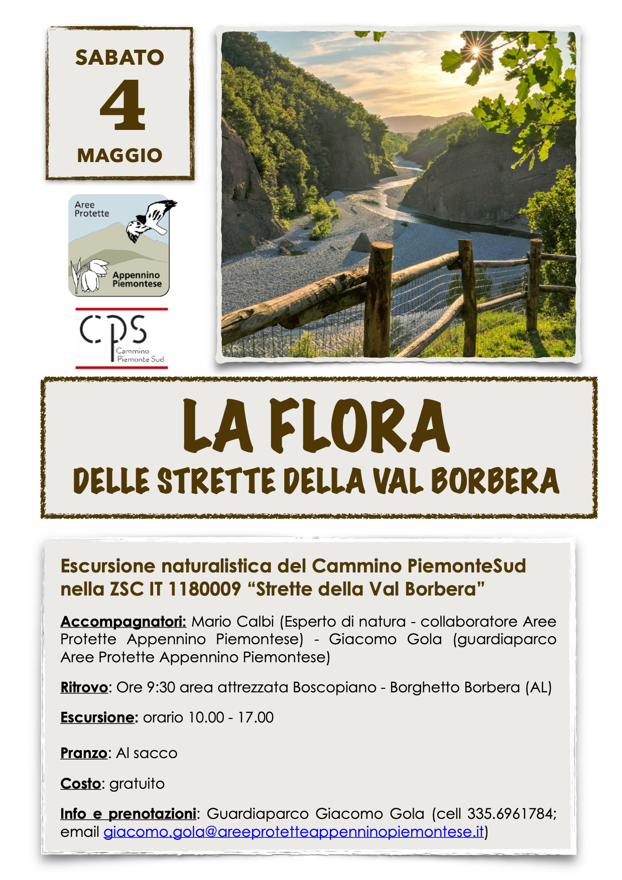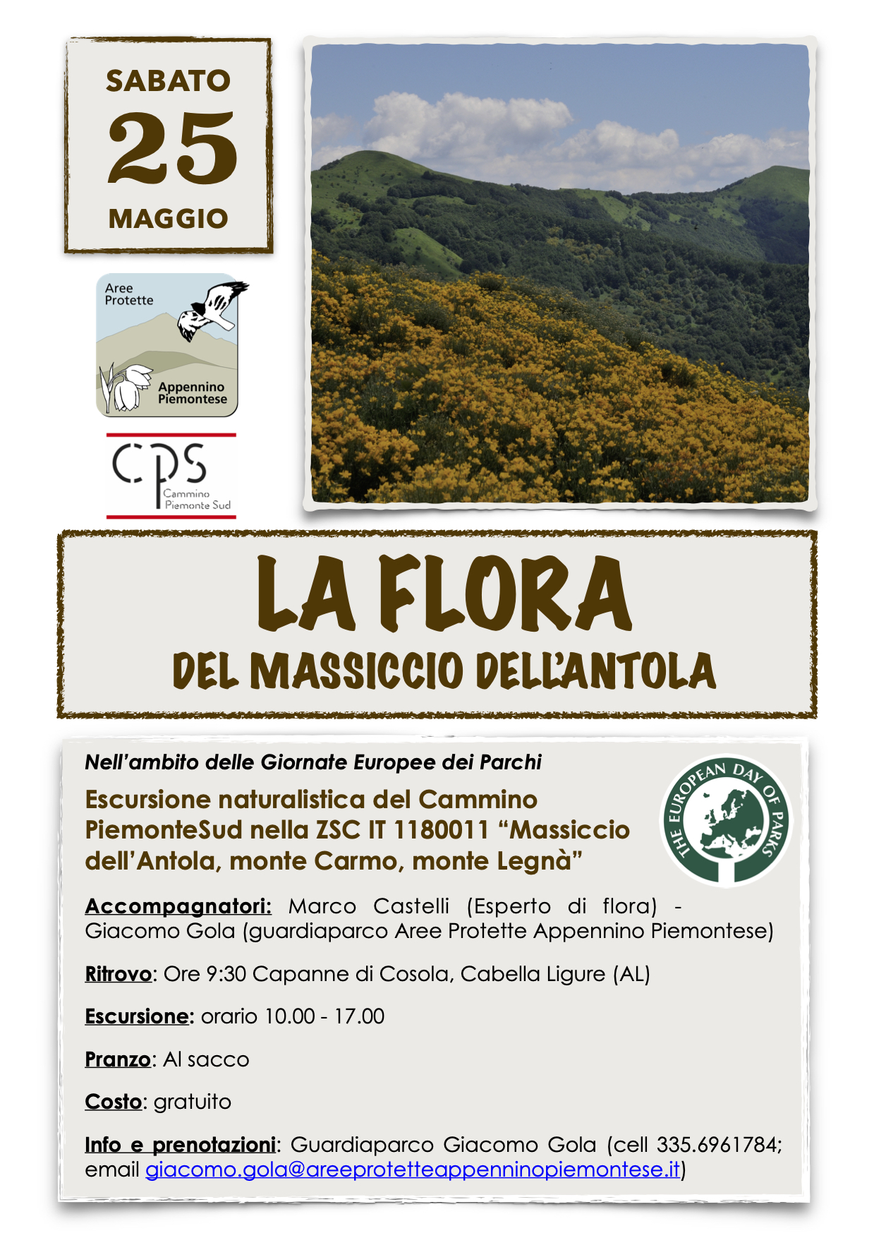 Per Info e prenotazioni: Guardiaparco Giacomo Gola (cell 335.6961784; email giacomo.gola@areeprotetteappenninopiemontese.it)