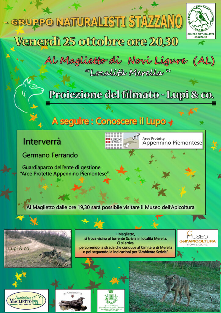 Venerdì 25 ottobre il Gruppo Naturalisti di Stazzano ha organizzato, presso il Maglietto e Museo dell’apicoltura di Novi Ligure (AL), una proiezione di un filmato dedicato al lupo e alla fauna selvatica dell’Appennino Piemontese, realizzato con un collage di immagini ottenute con video trappole.