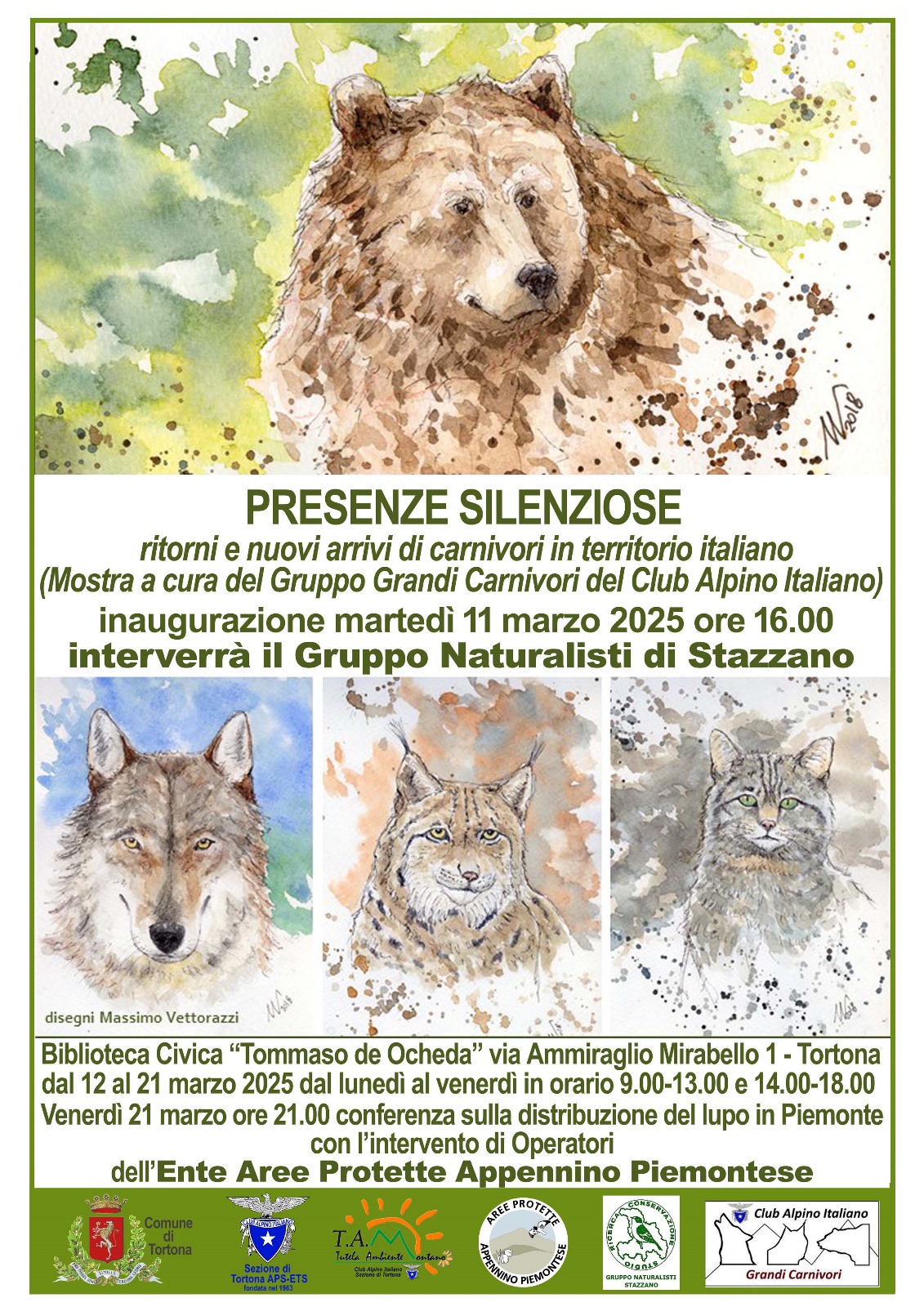 Inoltre dall’11 al 21 marzo, sempre presso la Biblioteca Civica di Tortona, è stata esposta la mostra “PRESENZE SILENZIOSE – Ritorni e nuovi arrivi di carnivori in territorio italiano” a cura del Gruppo Grandi Carnivori del Club Alpino Italiano con l’intervento del Gruppo Naturalisti di Stazzano.