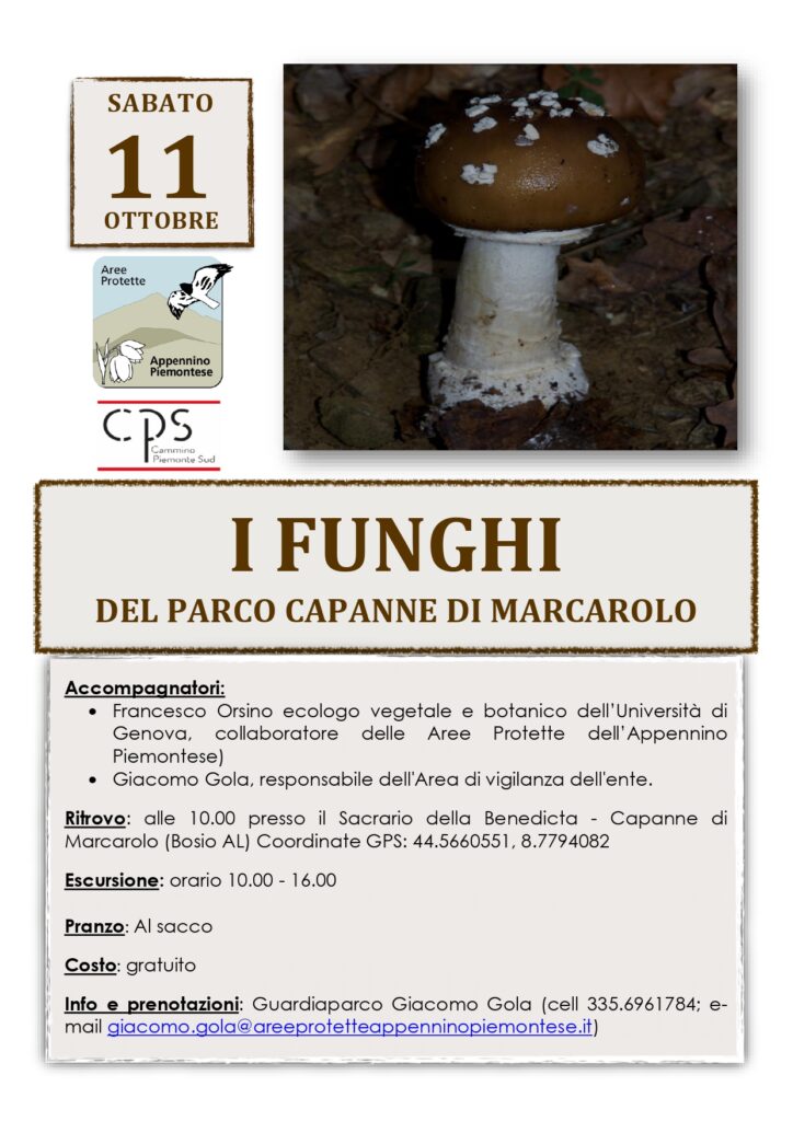 Sabato 11 ottobre 2025, l’Ente di gestione delle Aree Protette Piemontese, nell’ambito del progetto di promozione del Cammino PiemonteSud, organizza un’escursione nel Parco Naturale delle Capanne di Marcarolo, finalizzata al riconoscimento e allo studio delle caratteristiche dei funghi.
