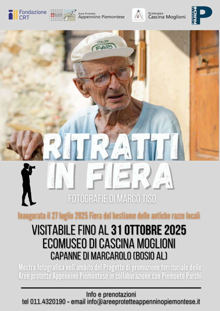 Sarà visitabile fino al 31 ottobre la mostra fotografica “Ritratti in fiera”, allestita nell’ambito di un progetto di promozione territoriale delle Aree Protette dell’Appennino Piemontese in collaborazione con Piemonte Parchi: 22 ritratti dedicati ai volti dei partecipanti alla Fiera del bestiame delle antiche razze locali di Capanne di Marcarolo (Bosio AL), allevatori, produttori, visitatori.