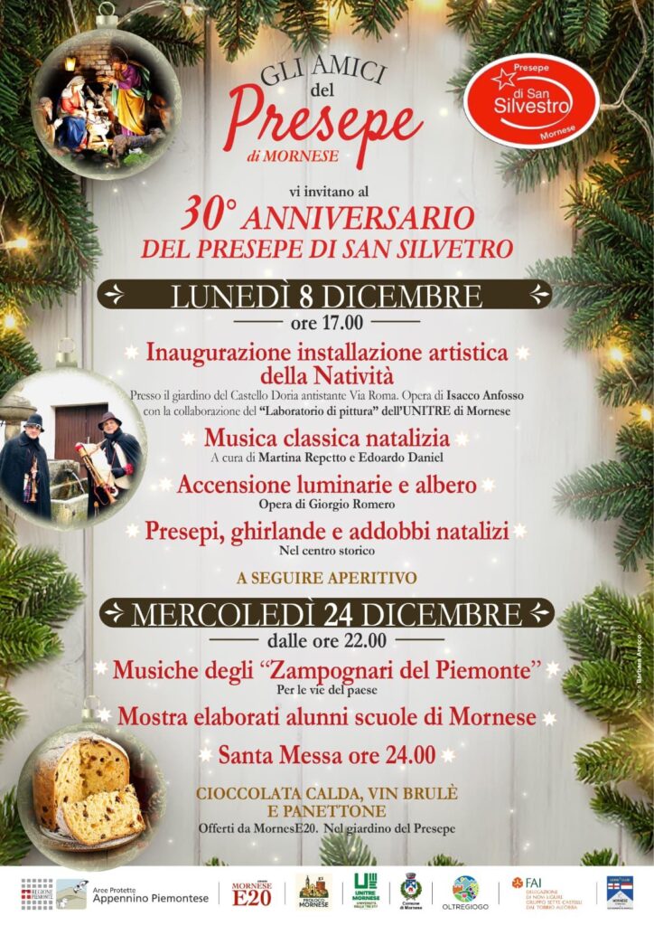 Il Comitato “Amici del Presepe Artistico di San Silvestro di Mornese” in collaborazione con l’Ente di gestione delle Aree Protette dell’Appennino Piemontese, il Comune di Mornese, il circolo MorneseE20 , l’UNITRE di Mornese, i Lions Club Mornese – Oltregiogo e Alto Monferrato Orientale e la Delegazione FAI Novi Ligure, organizza un programma di festeggiamenti e attività aperte alla cittadinanza, in occasione 30° Anniversario del Presepe allestito nella cripta della Parrocchia di Mornese (AL).