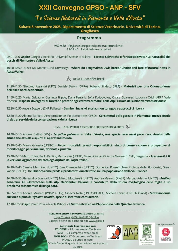 Sabato 8 novembre 2025, il personale di vigilanza dell’Ente di Gestione delle Aree Protette dell’Appennino Piemontese ha preso parte alla XII edizione del Convegno “Le Scienze Naturali in Piemonte e Valle d’Aosta”. L’evento, promosso da GPSO, ANP e Société de la Flore Valdôtaine, si è svolto presso l’Aula Magna A della Scuola di Agraria e Medicina Veterinaria a Grugliasco (TO), attirando numerosi ricercatori e appassionati e confermandosi quale importante momento di confronto tra il mondo accademico e gli Enti dei Parchi naturali.